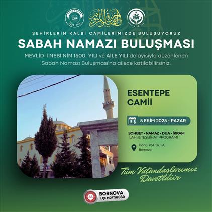 Bornova İlçe Müftülüğü Esentepe Camii Sabah Namazı Buluşması'na tüm vatandaşlarımız davetlidir.