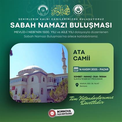 Bornova İlçe Müftülüğü Ata Camii Sabah Namazı Buluşması'na tüm vatandaşlarımız davetlidir.