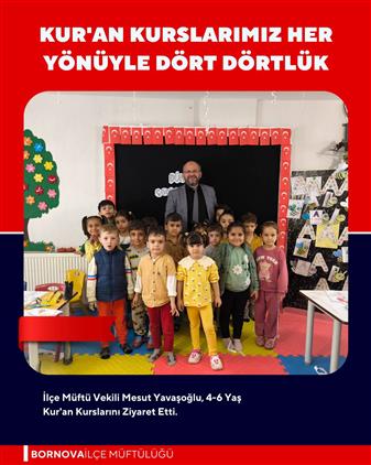 Bornova İlçe Müftü Vekili Sayın Mesut Yavaşoğlu, 20 Kasım Çocuk Hakları Günü vesilesiyle İlçe Müftülüğü'ne ballı olarak Pınarbaşı bölgesinde eğitimlerine devam eden Hacı Zehra Demirciler, Kasap Osman ve Camisap Babamir 4-6 Yaş Kur'an Kurslarını ziyaret etti. Öğrencilerle yakından ilgilenen Yavaşoğlu, kurs bölümlerini inceledi, öğreticilerimizden bilgi aldı.