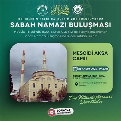 Bornova İlçe Müftülüğü Mescidi Aksa Camii Sabah Namazı Buluşması'na tüm vatandaşlarımız davetlidir.