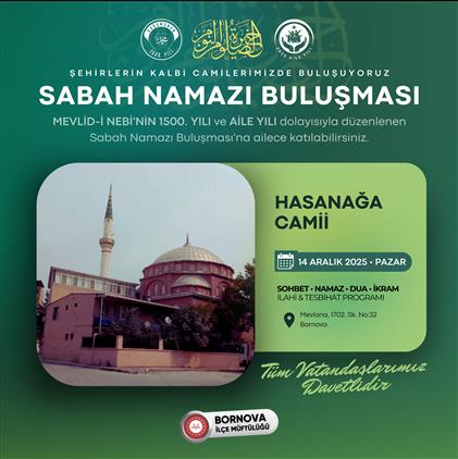 Bornova İlçe Müftülüğü Hasanağa Camii Sabah Namazı Buluşması'na tüm vatandaşlarımız davetlidir.