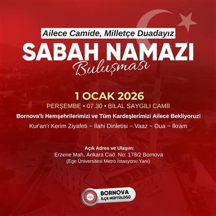 Şehirlerin Kalbi Camide Buluşalım Projesi kapsamında yeni yılın ilk gününde Bornova İlçe Müftülüğü tarafından Bilal Saygılı Camii'nde düzenlenen Sabah Namazı Buluşması'na ailece davetlisiniz.