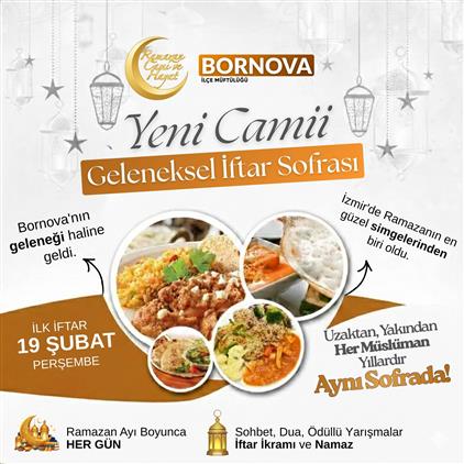 Bornova'da Ramazan ayı geleneklerinden ve İzmir'in simgelerinden biri olan Yeni Camii Geleneksel İftar Sofrası; bu Ramazan ayında da uzaktan yakından, her kesimden, her yaştan müslümanları aynı sofrada buluşturuyor.