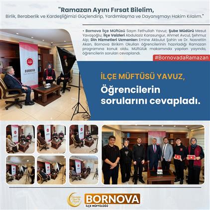 Bornova İlçe Müftüsü Sayın Fethullah Yavuz; Şube Müdürü Mesut Yavaşoğlu; İlçe Vaizleri Abdulaziz Karasungur, Ahmet Avcul, Şehmuz Alp; Din Hizmetleri Uzmanları Emine Akbulut Şahin ve Dr. Nasrettin Akan, Bornova Birikim Okulları öğrencilerinin hazırladığı Ramazan programına konuk oldu. Müftülük makamında yapılan yayında, öğrencilerin soruları cevaplandı.