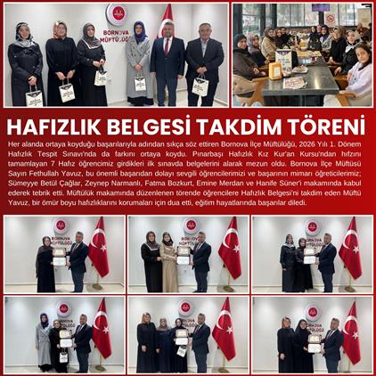 Her alanda ortaya koyduğu başarılarıyla adından sıkça söz ettiren Bornova İlçe Müftülüğü, 2026 Yılı 1. Dönem Hafızlık Tespit Sınavı'nda da farkını ortaya koydu. Pınarbaşı Hafızlık Kız Kur'an Kursu'ndan hıfzını tamamlayan 7 Hafız öğrencimiz girdikleri ilk sınavda belgelerini alarak mezun oldu. Bornova İlçe Müftüsü Sayın Fethullah Yavuz, bu önemli başarıdan dolayı sevgili öğrencilerimizi ve başarının mimarı öğreticilerimiz; Sümeyye Betül Çağlar, Zeynep Narmanlı, Fatma Bozkurt, Emine Merdan ve Hanife Süner'i makamında kabul ederek tebrik etti. Müftülük makamında düzenlenen törende öğrencilere Hafızlık Belgesi’ni takdim eden Müftü Yavuz, bir ömür boyu hafızlıklarını korumaları için dua etti, eğitim hayatlarında başarılar diledi.