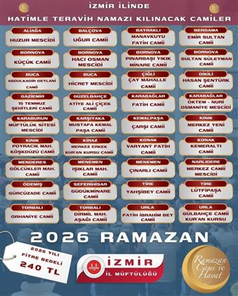 İZMİR İLİ HATİMLE TERAVİH NAMAZI KILINACAK CAMİ LİSTESİ