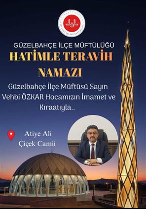 İlçemizde ilk defa "Hatimle Teravih Namazı" İlçe Müftümüz Vehbi ÖZKAR hocamızın kıraatıyla Atiye Ali Çiçek Cami'inde eda edilecektir. Tüm vatandaşlarımızı bekliyoruz.